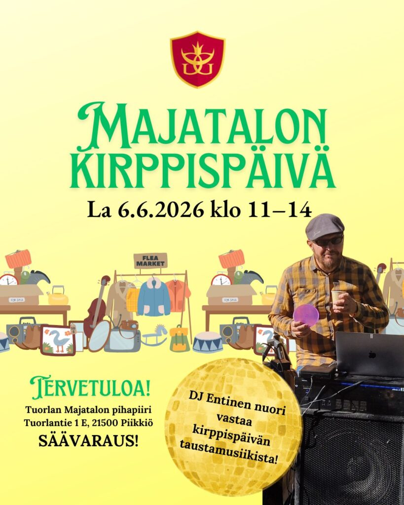 Tervetuloa Tuorlan Majatalon pihalla järjestettävään kirppistapahtumaan lauantaina 6.6.2026 klo 11–14! Viime elokuussa ensimmäisen kerran järjestetty kirppispäivä järjestetään nyt kolmannen kerran, ja Dj Entinen nuori saapuu jälleen viihdyttämään niin myyjiä kuin asiakkaitakin. Auringonpaistetta on tilattu, mutta tapahtumalla on säävaraus!
